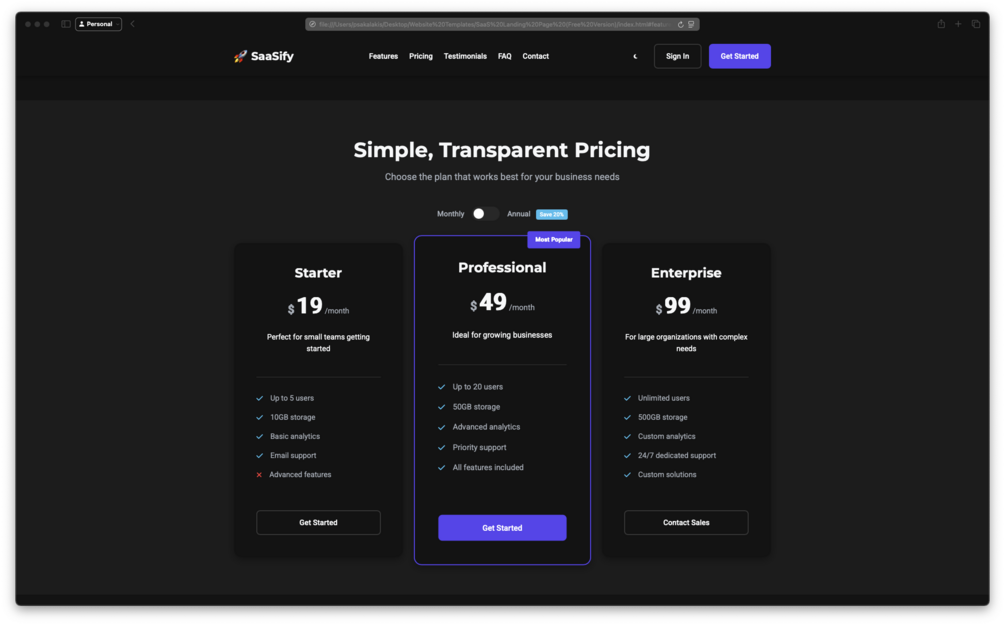 - Interactive Elements: FAQ accordions, form validation, and pricing toggle.