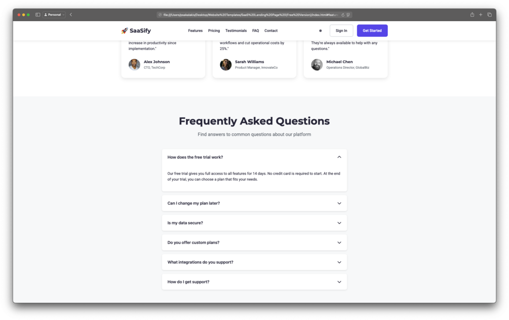 With SaaSify, you get a complete, ready-to-use landing page that works seamlessly across all devices. The template includes a light and dark mode with automatic system preference detection, interactive FAQ accordions, pricing toggles, and forms. Every component is thoughtfully designed to be reusable, making customization simple and fast.