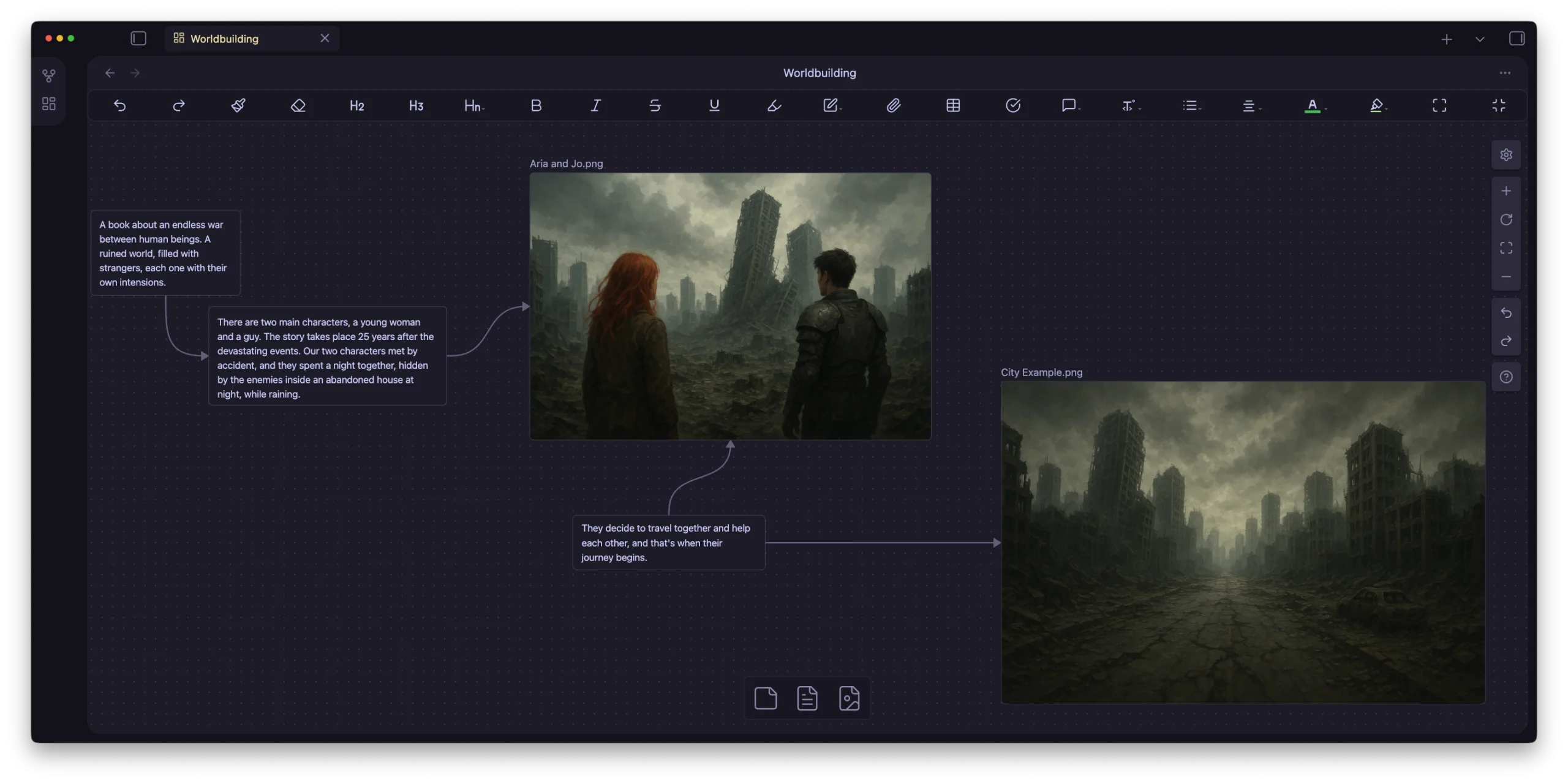 - Excalidraw: This is the ultimate plugin that I use to create Canvas, which is what you see in the “Worldbuilding” canvas file that’s included in the Vault. It’s a great way to start connecting your story and seeing it come alive as you progress.